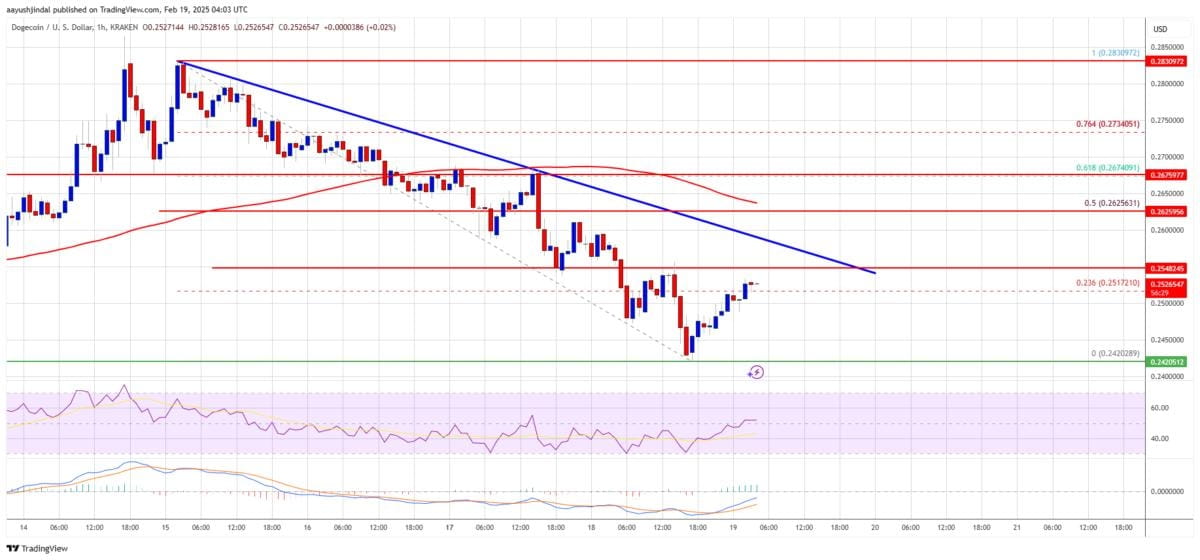 Există o linie de tendință bearish conectată care se formează cu rezistență la $0.2560 pe graficul orar al perechii DOGE/USD (sursa de date de la Kraken).