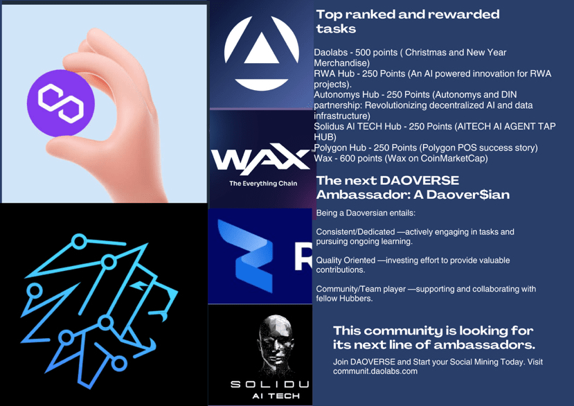 DAOVERSE este o platformă descentralizată unde participanții, denumiți Hubbers, se angajează în Social Mining, care recompensează participarea semnificativă, creativitatea și munca de înaltă calitate. Utilizatorii pot câștiga recompense completând sarcini în timp ce contribuie la expansiunea DAOVERSE. Dacă ești entuziast în legătură cu descentralizarea și dorești să te implici, ia în considerare să te alături DAOVERSE Social Mining astăzi.