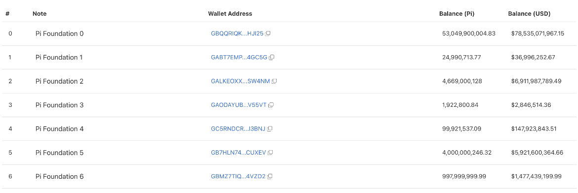Cele mai recente date relevă că echipa centrală a rețelei Pi controlează aproximativ 62,8 miliarde de Pi Coins distribuite pe șase portofele. În plus, aproximativ 20 de miliarde de PI se află în aproximativ 10.000 de portofele neenumerate aparținând echipei.