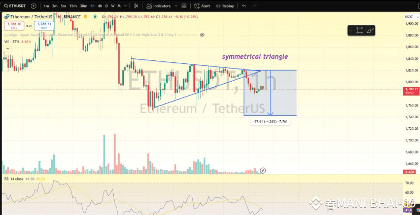 has broken down from a symmetrical triangle, which is generally a neutral pattern. However, after the breakdown and a retest, ETH is now looking bearish. Technically, there’s a strong possibility for further downside.