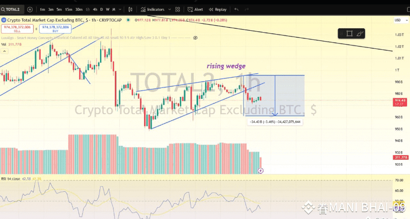 Total 2 (crypto market cap excluding BTC) has broken down from a rising wedge — a bearish pattern. This indicates bearish momentum, so altcoins might start dropping soon.