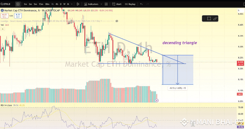 ETH dominance is forming a descending triangle — a bearish chart pattern. A retest toward the upper trendline is likely, but after that, we could see another move down. Be cautious and always manage your risk. Avoid using high leverage.
