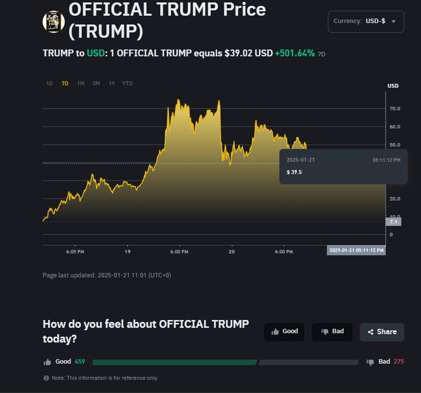 În prezent, $TRUMP se mișcă cu o rată de $39,5, iar prețul său fluctuează rapid. Tokenul a reușit să ajungă la $75,35 la scurt timp după listare, dar a început să scadă regulat. Aceste cifre indică acțiunea notabilă a pieței monedei și oscilațiile de preț, tipice pentru monedele meme.