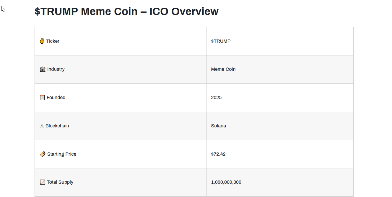 Pe 18 ianuarie 2025, cu câteva zile înainte de a prelua funcția de președinte al Statelor Unite, Donald Trump a dezvăluit moneda meme Trump pe conturile sale de socializare. El a numit-o „Moneda Meme Oficială Trump.” Mulți cred că aceasta este o încercare calculată din partea președintelui nou ales de a interacționa cu comunitatea criptomonedelor.
