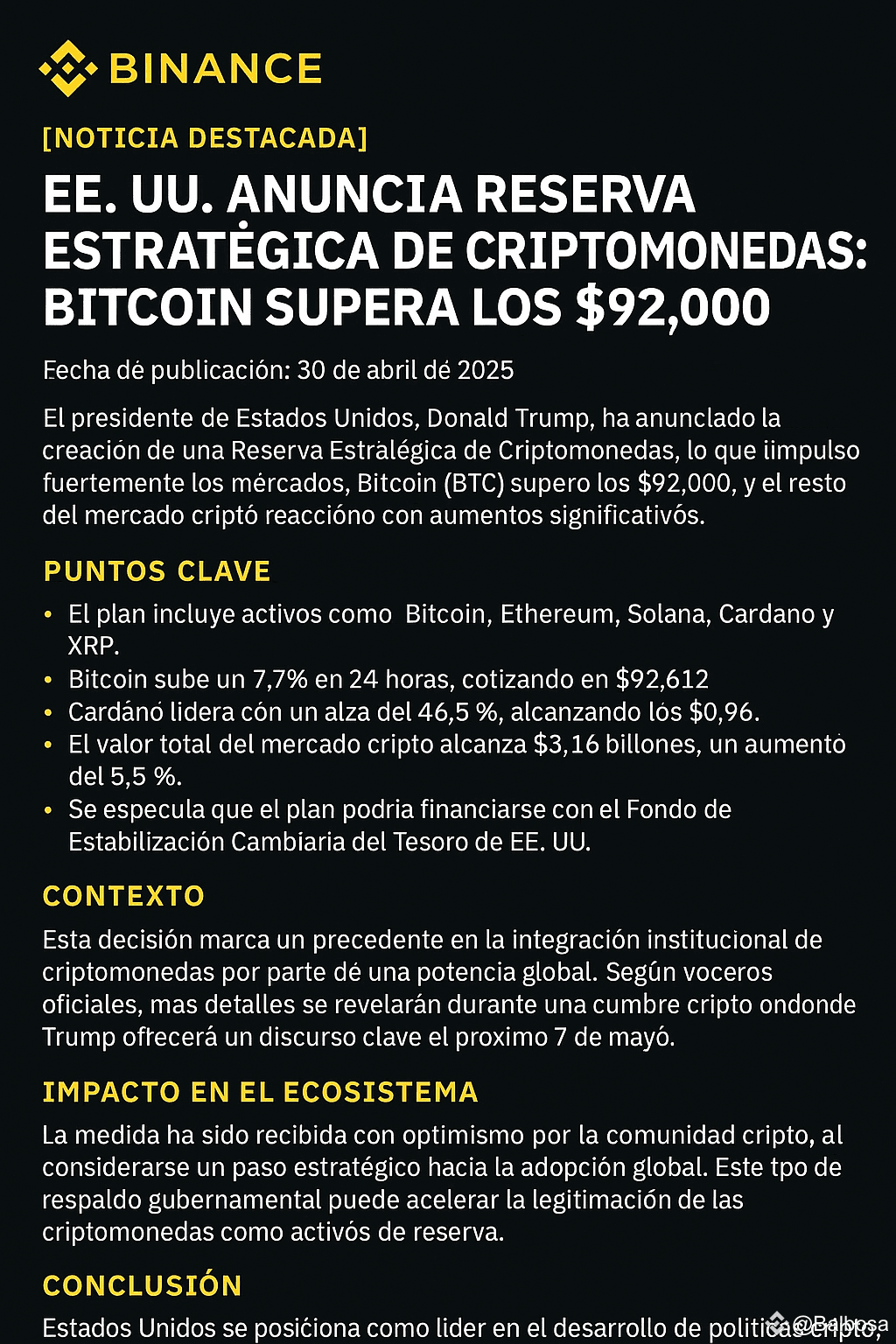 Esta decisión marca un precedente en la integración institucional de criptomonedas por parte de una potencia global. Según voceros oficiales, más detalles se revelarán durante una cumbre cripto donde Trump ofrecerá un discurso clave el próximo 7 de mayo.