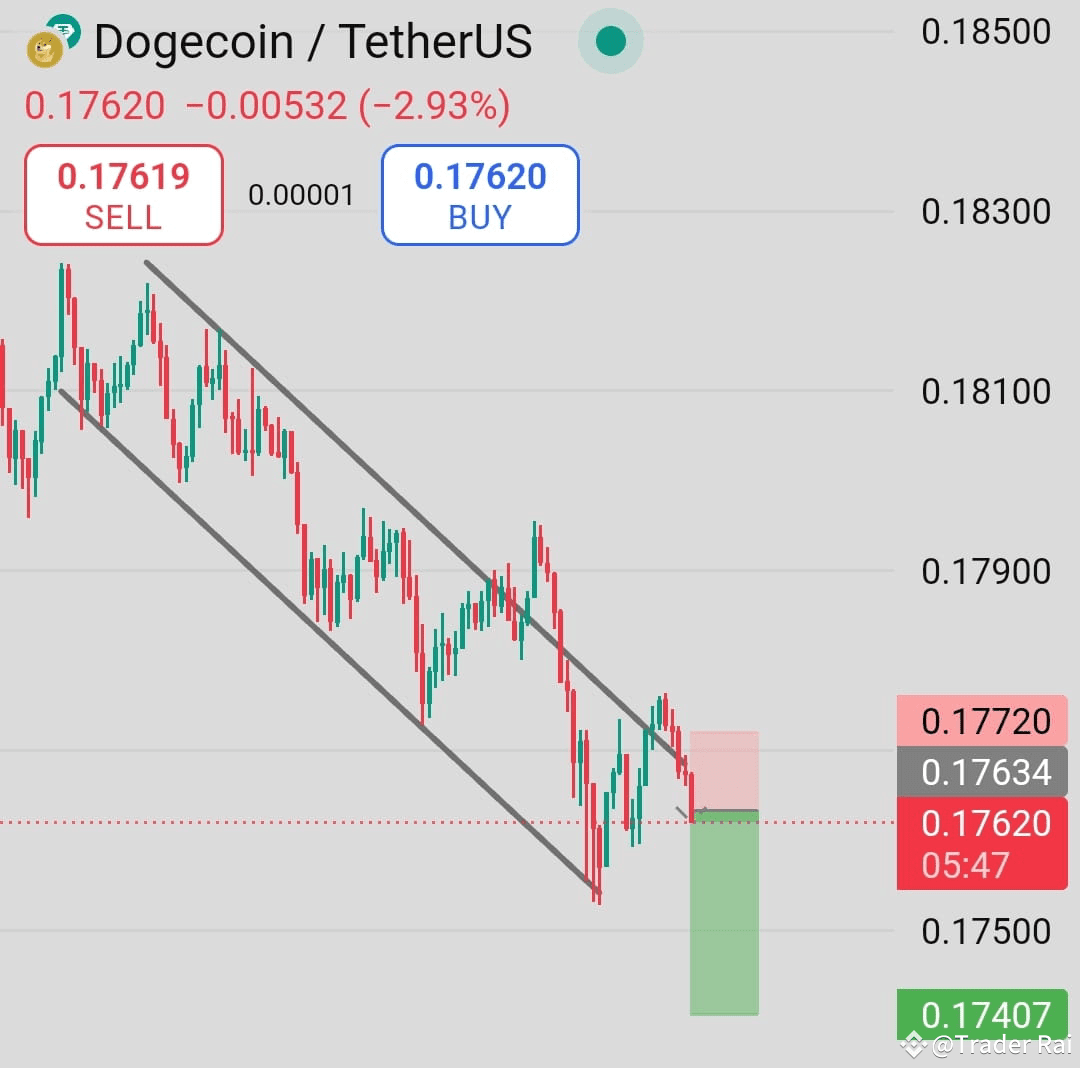 $DOGE tocmai a fost doborât la vârful canalului său descendent, nereușind să depășească rezistența de $0.1772. Această respingere semnalează că urșii sunt încă ferm la control și tendința rămâne înclinată în jos.