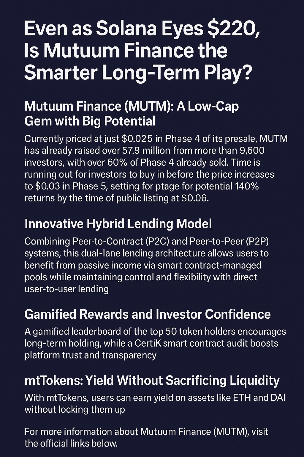Deși $SOL Solana ar putea continua să crească către $220, Mutuum Finance oferă o oportunitate rară de început. Cu tehnologie inovatoare, tokenomics puternic și un moment în creștere, MUTM ar putea fi următorul jucător major în finanțele descentralizate.