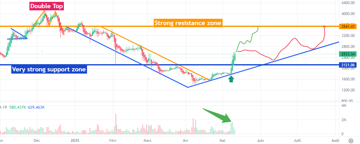 Caz bearish (cale roșie): ETH este respins aproape de rezistență și se consolidează sau testează din nou zona $2500–$2120 înainte de o altă încercare.