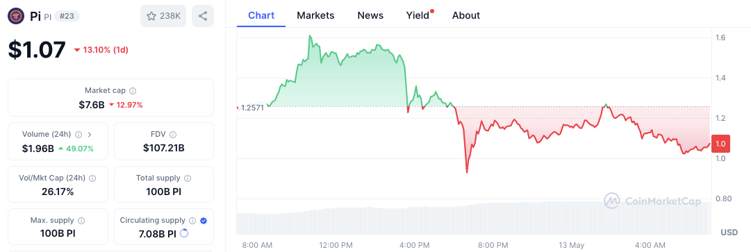 În timp ce prețul PI s-a stabilizat în jurul valorii de 1,00 dolari, modelele de grafice arată o scădere bruscă urmată de o recuperare care nu a reușit să se mențină în primele zile ale lui 13 mai. Scăderea capitalizării de piață a Pi Coin este, de asemenea, acum un punct cheie de interes.