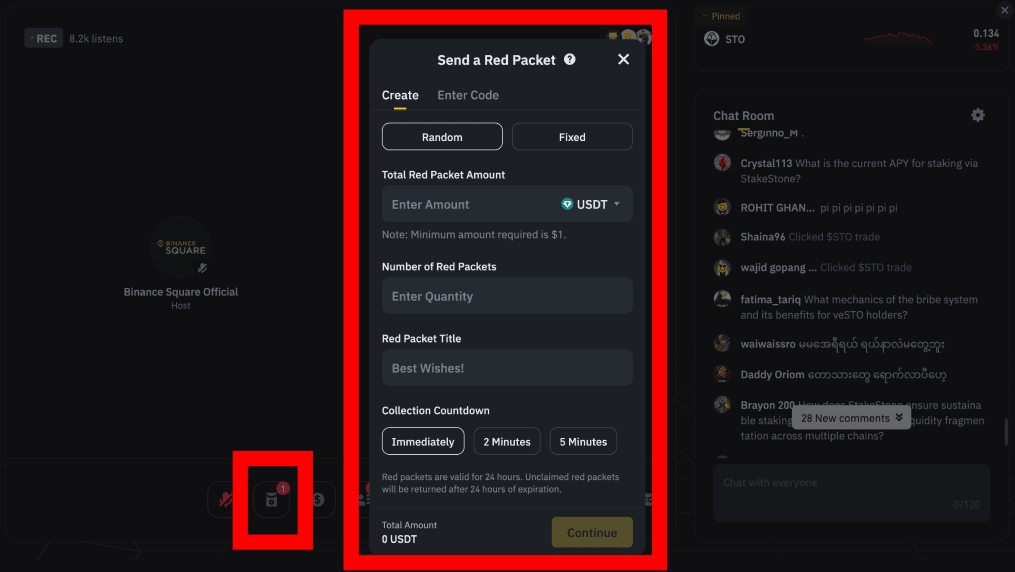 Alegeți tipul și suma pachetului roșu; spectatorii apasă pentru a revendica în timp ce cronometrul este activ.