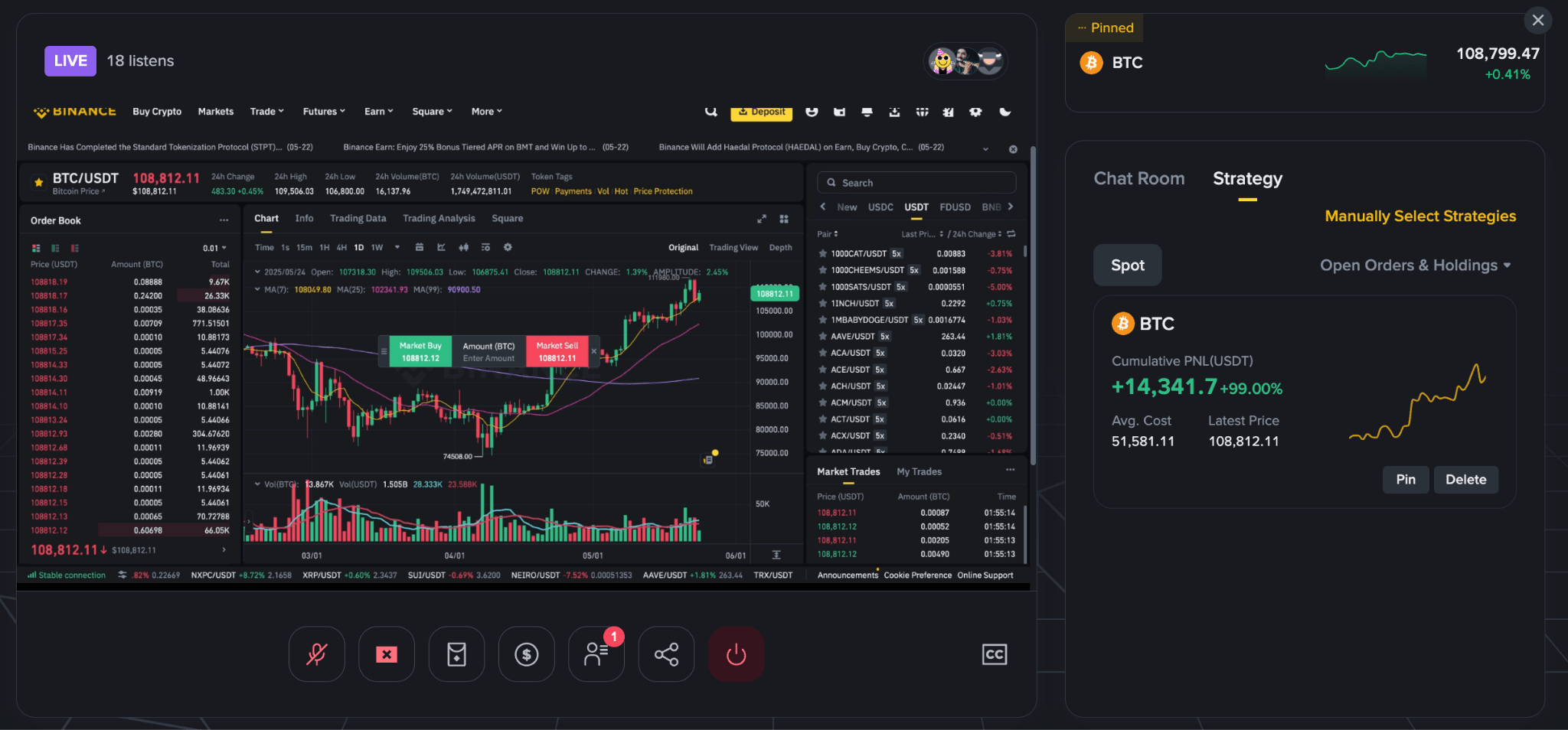 Creatorii eligibili cu cel puțin 1.000 de urmăritori pe Binance Square pot împărtăși până la 100 de tranzacții anterioare în timpul unei sesiuni, pot fixa carduri de strategie pentru vizibilitate în timpul transmisiunii și pot câștiga până la 50% comision din taxele de tranzacționare atunci când utilizatorii urmează strategiile lor.