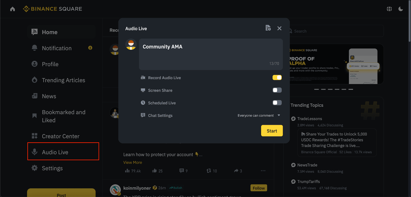 Binance Square suportă acum Audio Live (similar cu X Space și Clubhouse) și Livestreams (similar cu YouTube Lives și Twitch).