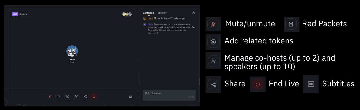 Audio Live permite utilizatorilor să comunice prin audio în timp real și să distribuie recompense cripto în pachete roșii către ascultători, cu opțiunea de a da bacșișuri care va veni în curând.