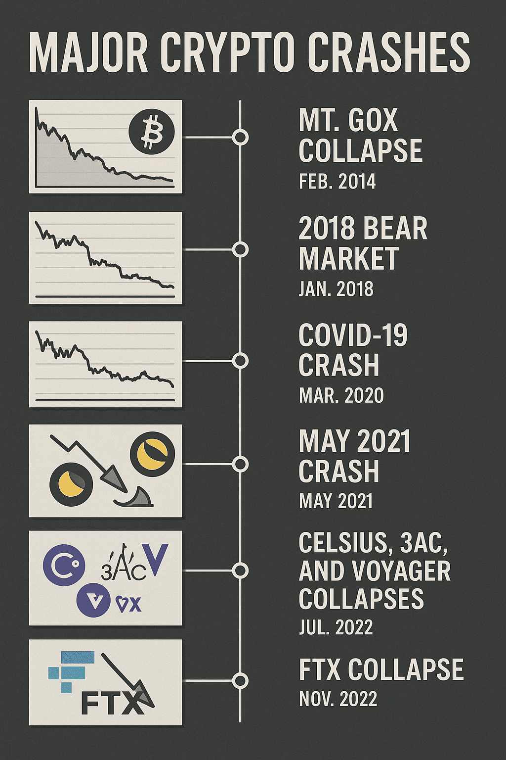 Aceste colapsuri au modelat peisajul de reglementare, psihologia investitorilor și designul proiectelor în crypto. Spune-mi dacă ai dori un timeline vizual sau mai multe date despre un colaps specific.