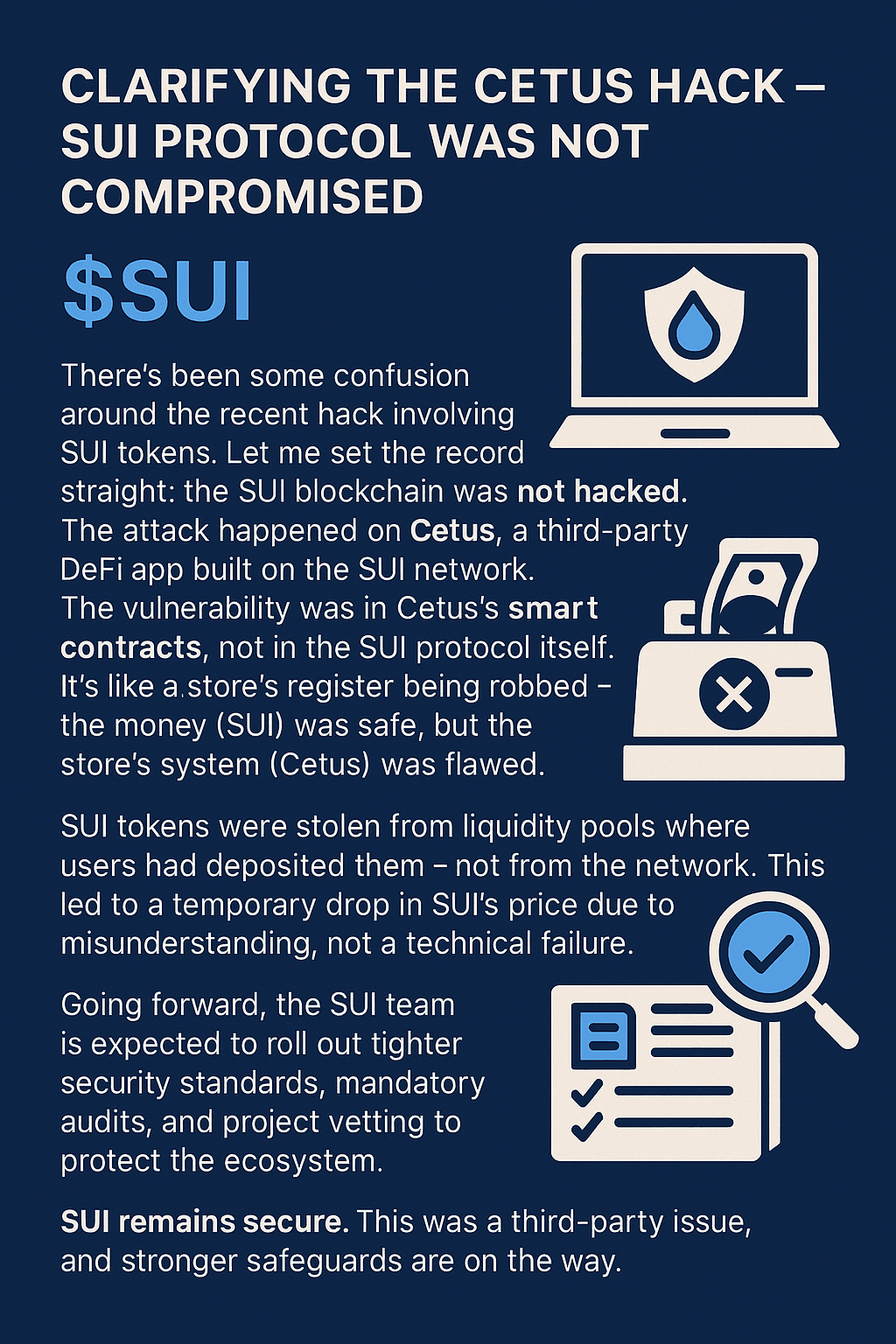 Vulnerabilitatea a fost în contractele inteligente ale Cetus, nu în protocolul $SUI în sine. Este ca și cum casa de marcat a unui magazin ar fi fost jefuită – banii (SUI) erau în siguranță, dar sistemul magazinului (Cetus) era defect.