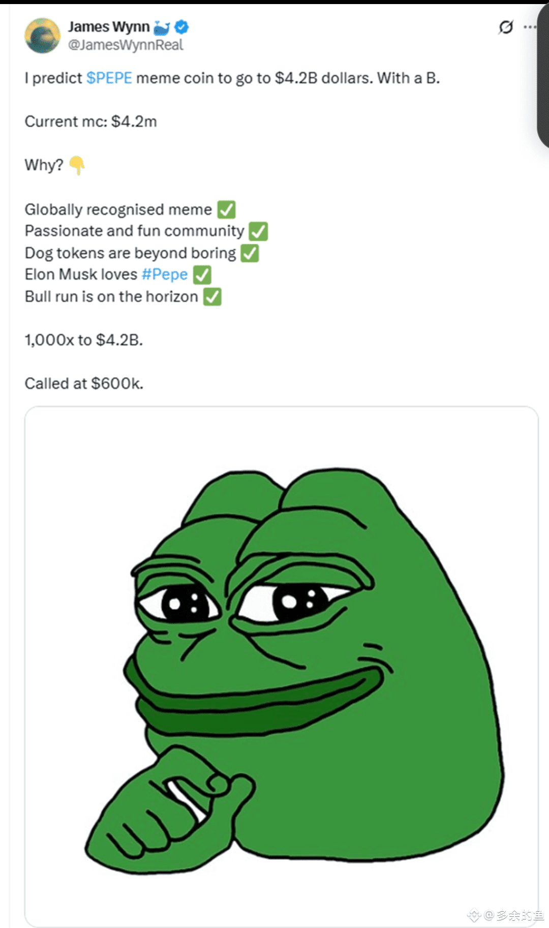 从社交媒体的信息来看,James Wynn在2023年开始加入推特,其初期的所有内容几乎都聚焦在PEPE币的推广和宣传上。2023年4月,James Wynn就预测PEPE代币的市值将涨到42亿美元。当时的市值是420万美元。时隔一年后,这个预言不仅成真,甚至超出了他当时的预期。2024年10月,PEPE市值最高突破100亿美元,成为市值最高的MEME币之一。