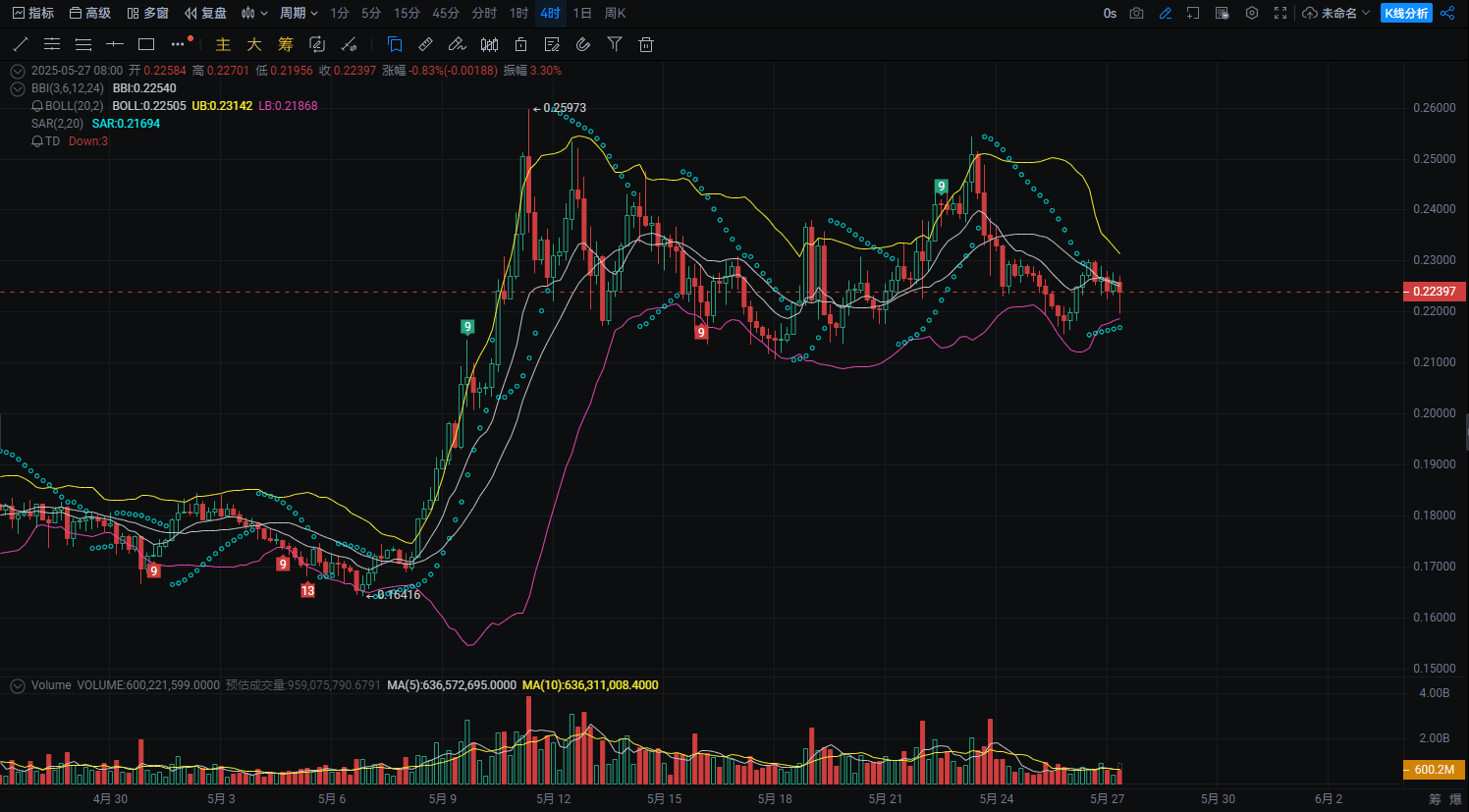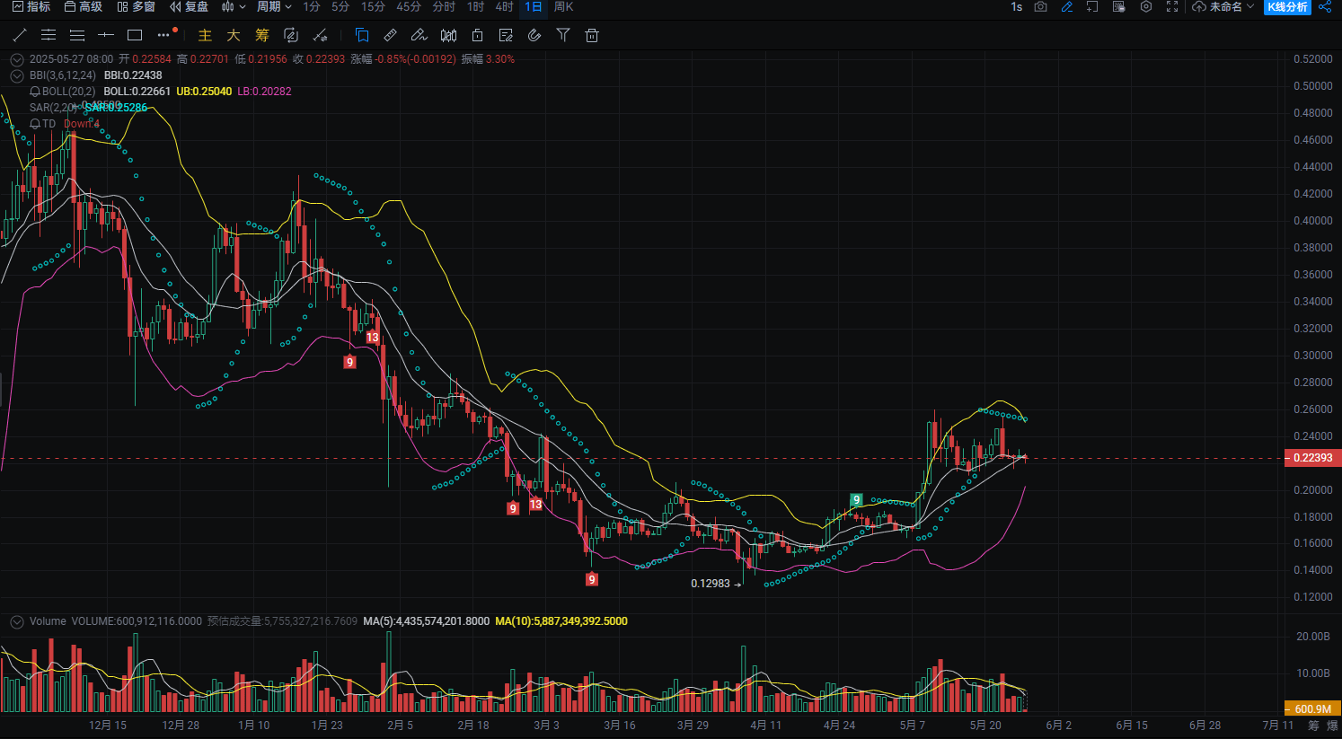 Starea BOLL: mediana susține 0.218, banda de jos se ridică constant, indicând că tendința nu s-a inversat;