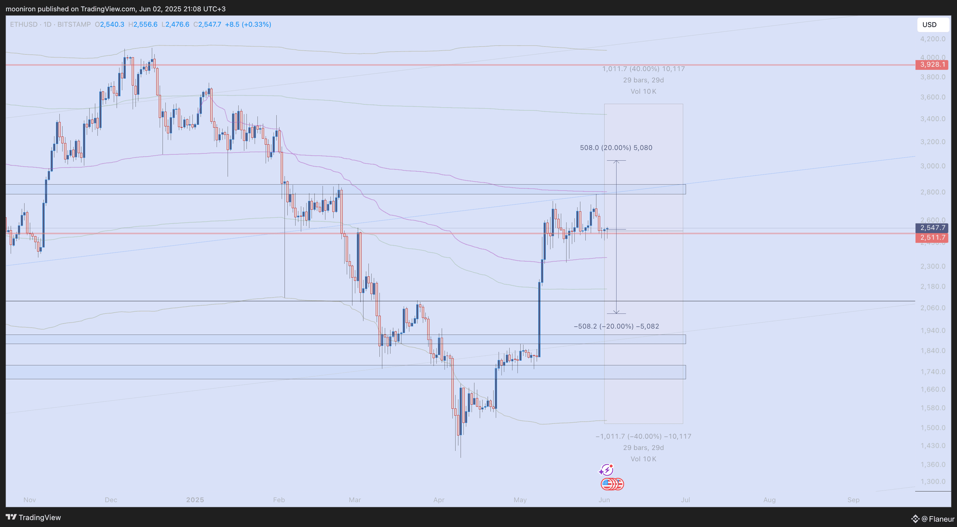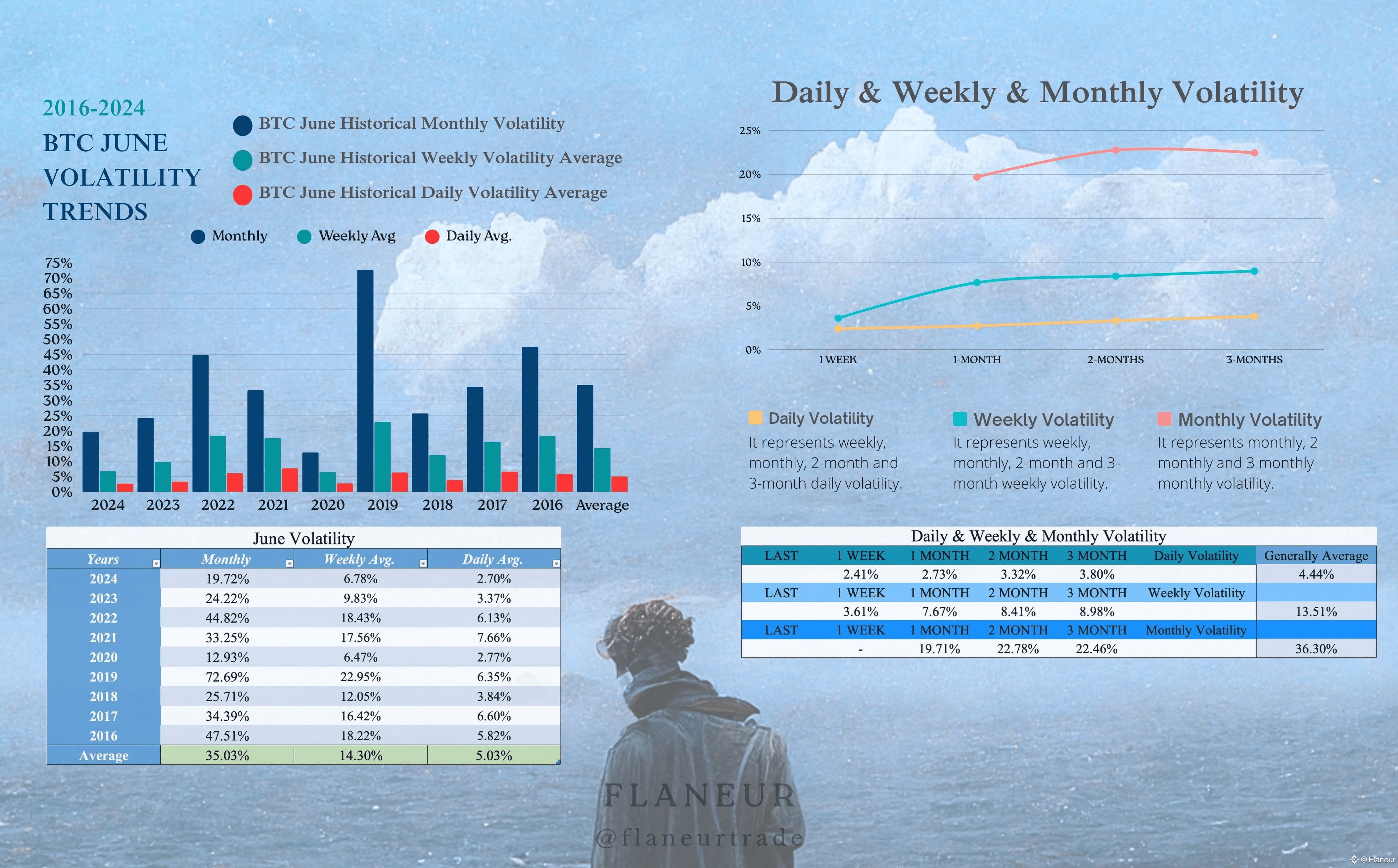 The monthly average implied volatility for June is 40%, corresponding to the $1500-$3550 region. The weekly average implied volatility is 20%, equating to the $2030-$3050 range. We've seen a significant increase in ETH's volatility over recent months, and it continues to rise.