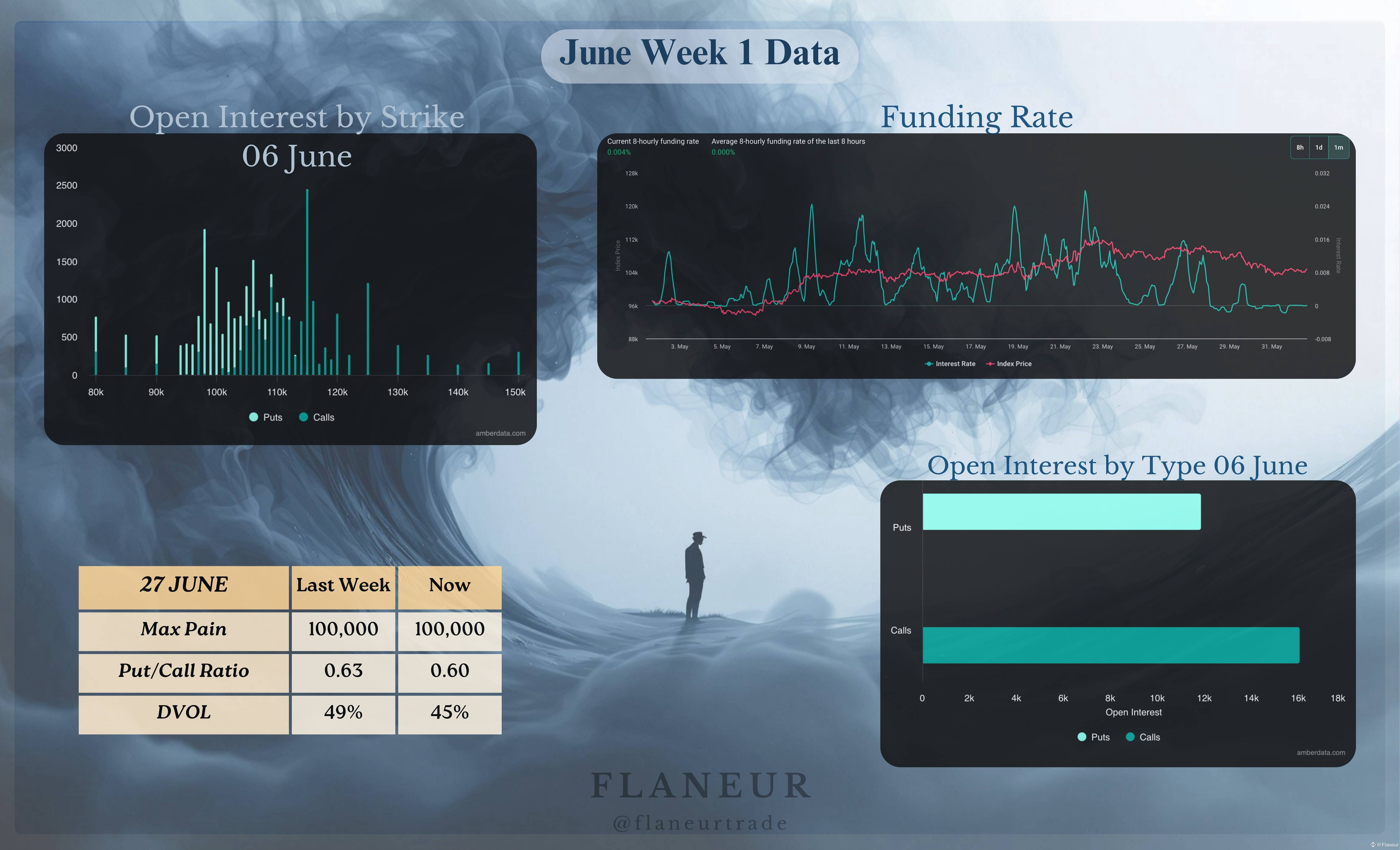 For the end-of-June contracts, the max pain price is $100k, and the Put/Call Ratio is 0.60, painting a very bullish picture. With the recent decrease in volatility, DVOL has dropped to 42% today. The Funding Rate has been at 0 for a while; if it turns negative during any potential correction, that would be one of the biggest bullish signals for me. For the June 6th weekly contract, the max pain price is $105k, and the Put/Call Ratio is 0.75, indicating a somewhat bullish sentiment. It's also worth noting that there's significant volume in the June contracts.