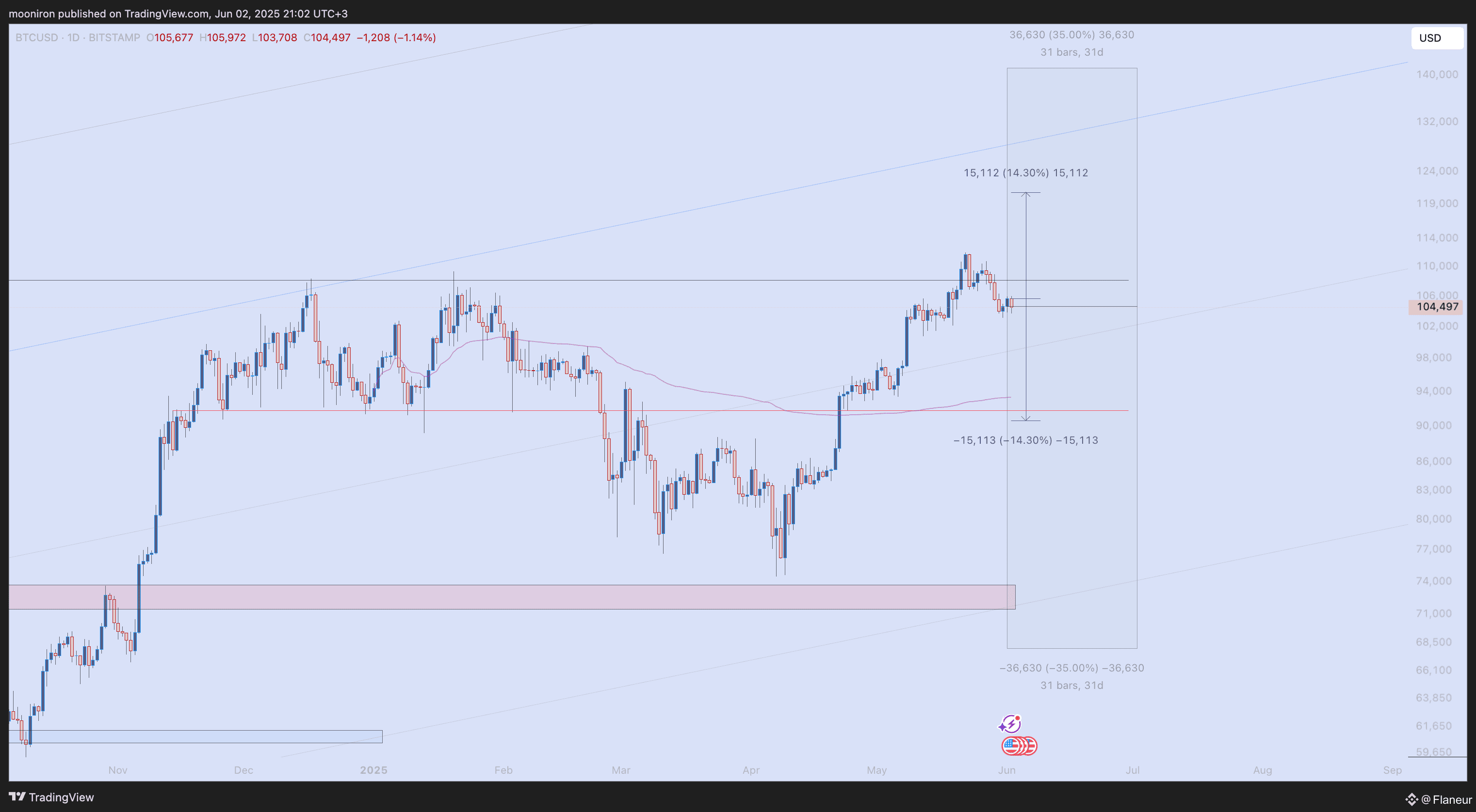 For June, the monthly implied volatility is 35%, and weekly is 14.3%. This suggests a range between $68k and $141k. We've observed a decrease in BTC's volatility in recent months. On a weekly basis, with 14.3% implied volatility, we can define the price range as $90k-$121k.