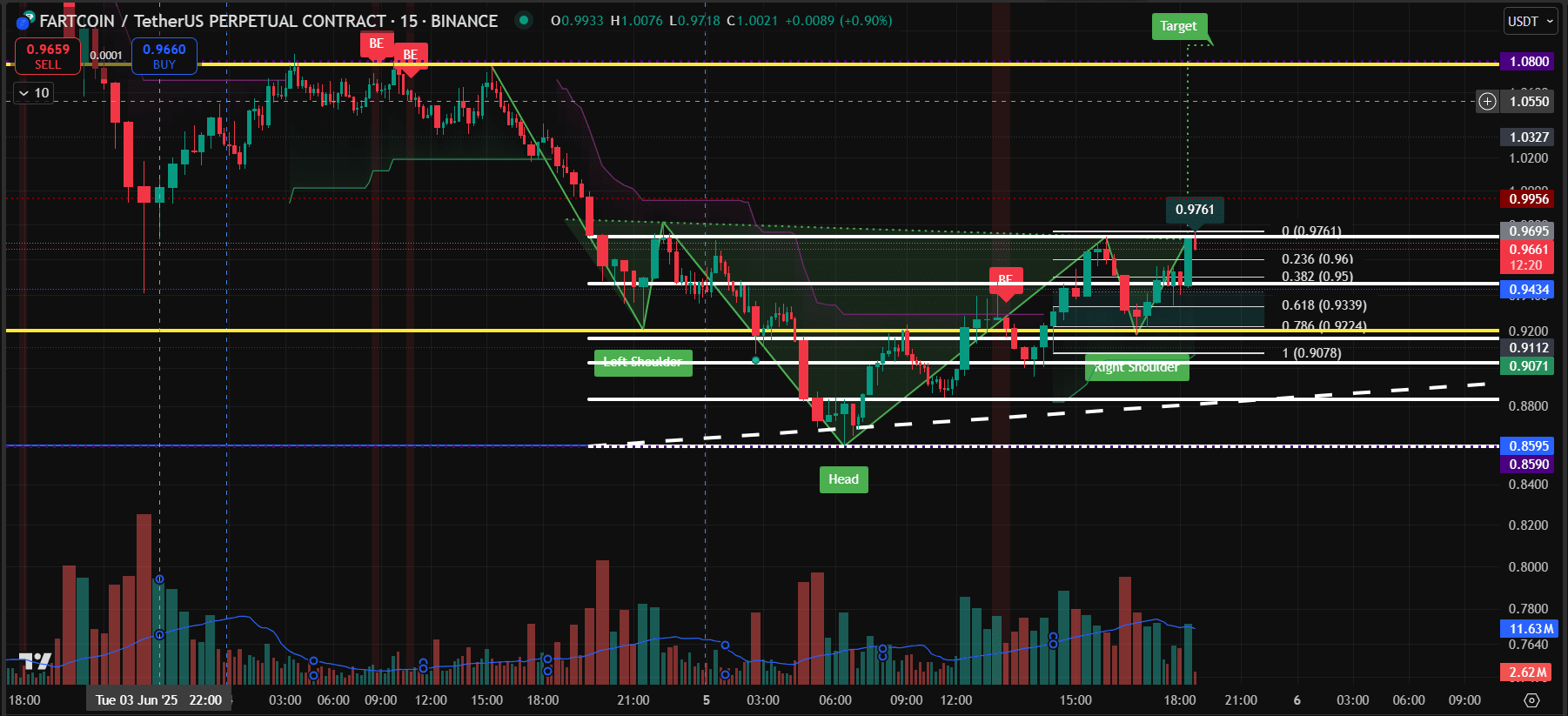 Privesc o setare long pe FARTCOIN/USDT cu un obiectiv de 1.08. Iată de ce, pe baza fluxului meu de ordine Bookmap și analiza graficului: