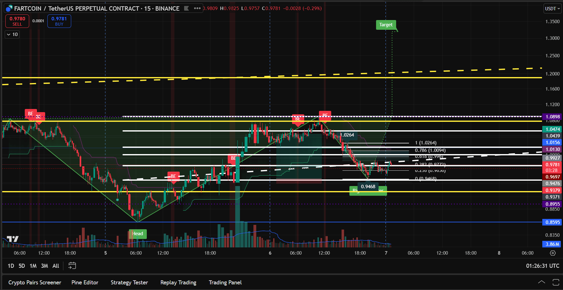 Planificarea inițială a încasării profitului poate fi realizată aproape de retragerea Fibonacci de 0.786 la 1.0094 USDT.