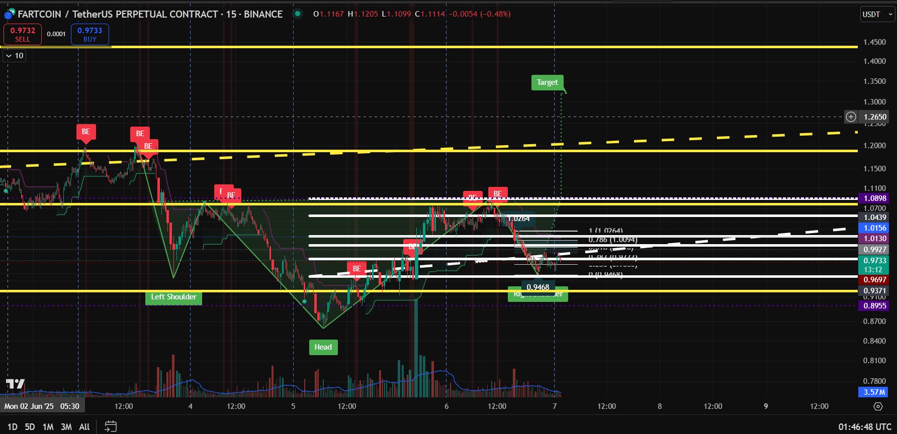 FARTCOIN arată o configurație potențială de reversare bullish pe graficul de 15 minute, susținută de semnale tehnice cheie și date de flux de ordine din Bookmap.