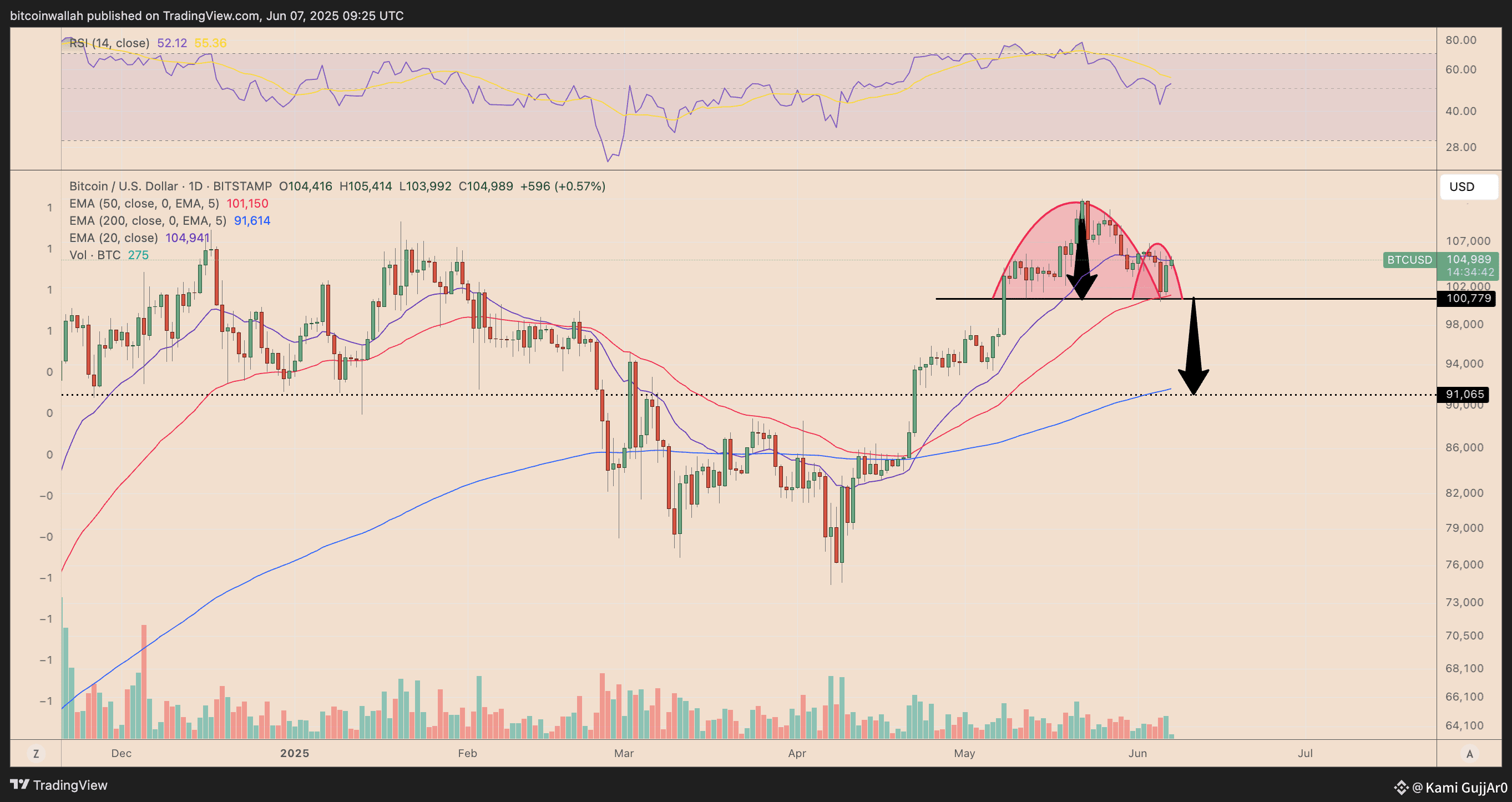 Bitcoin is painting what appears to be an inverse cup-and-handle pattern, with its neckline near $100,800 acting as current support. As of June 7, the price has entered the handle-formation stage, eyeing a breakdown below the neckline.