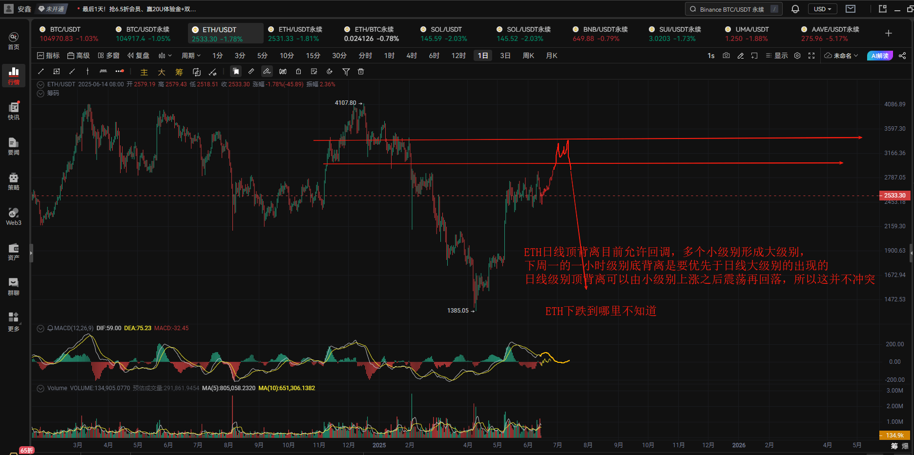 Deci ETH permite o divergență de fund pe oră să crească și apoi să scadă provocând o divergență de vârf pe linia zilnică. Atunci se poate forma BTC ETH simultan vârf și scădere,