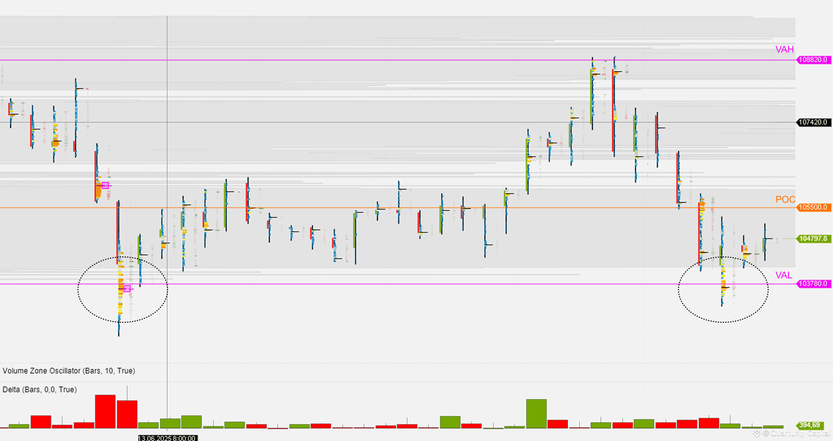 Как уже было написано здесь как ожидаемый сценарий: BTCUSDT: объёмный анализ и сценарии движения. Июнь 2025., импульсные продажи действительно были остановлены лимитным покупателем на уровне VAL - 103800, что подтверждает интерес к нему крупного покупателя.