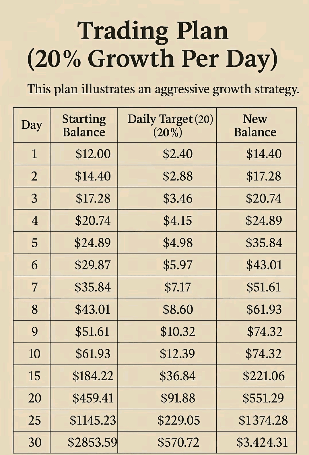 Acest plan urmează un model țintă de creștere de 20% pe zi, un obiectiv realist pentru traderii disciplinați în intraday în crypto, forex sau opțiuni binare folosind platforme ca Binance.