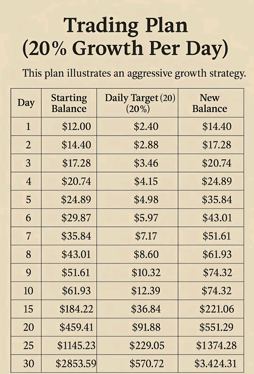 ➡️ În doar 30 de zile, $12 se pot transforma în $3.424,31 dacă urmezi ținta zilnică de 20%.