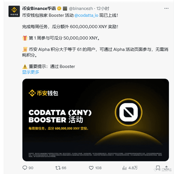 @codatta_io 携手 @binancezh,开启 为期12周的Booster活动,总奖池高达 6亿 $XNY,当前进行的是第一期第一周