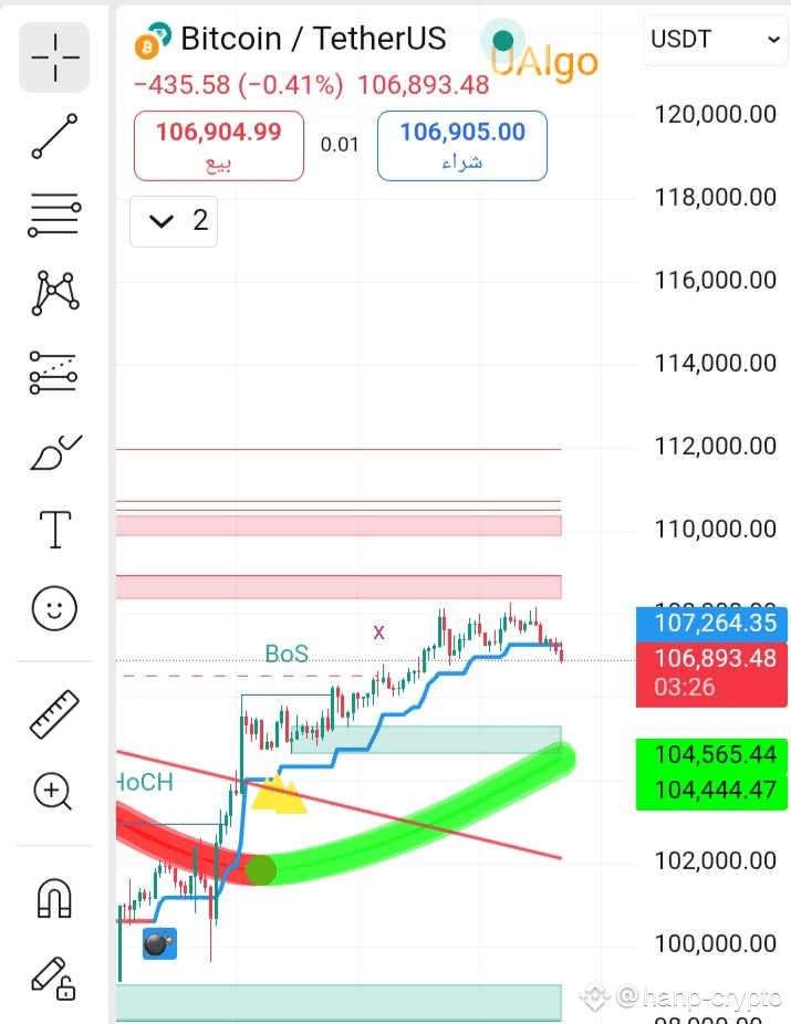 يظهر من الشارت أن البيتكوين (BTC/USDT) مرّ بموجة صعود قوية تجاوز خلالها مستويات 104,000 دولار، ليصل حاليًا إلى منطقة 106,900 دولار. هذه الحركة الصاعدة ترافقت مع اختراقات فنية مهمة (BoS) وتغير واضح في سلوك الاتجاه (CHoCH)، لكن السعر بدأ مؤخرًا في تصحيح هابط بسيط بعد بلوغ مقاومات متراكمة أعلى 110,000 دولار.