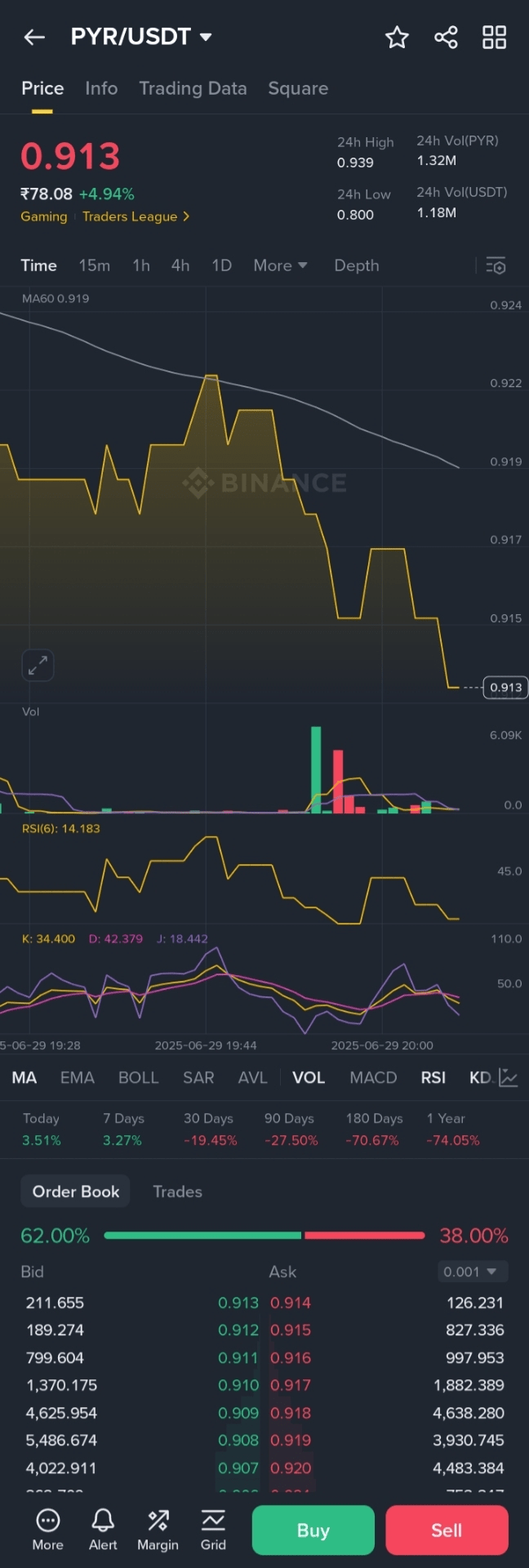 PYR se tranzacționează în jurul \$0.92, în creștere \~6% astăzi, într-un interval intraday de \$0.87–\$0.94; câștig de 7 zile \~9%.