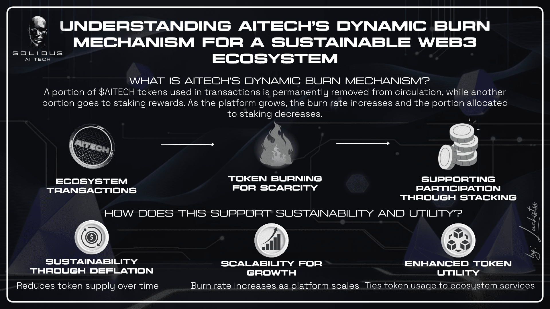 Mecanismul dinamic de ardere al AITECH este conceput pentru a optimiza tokenomics în ecosistemul său Web3. Tokenul $AITECH este fundamental pentru operațiunile de piață GPU și AI ale Solidus AI Tech, precum și pentru platforma sa de lansare. Iată cum funcționează de fapt din punct de vedere tehnic: