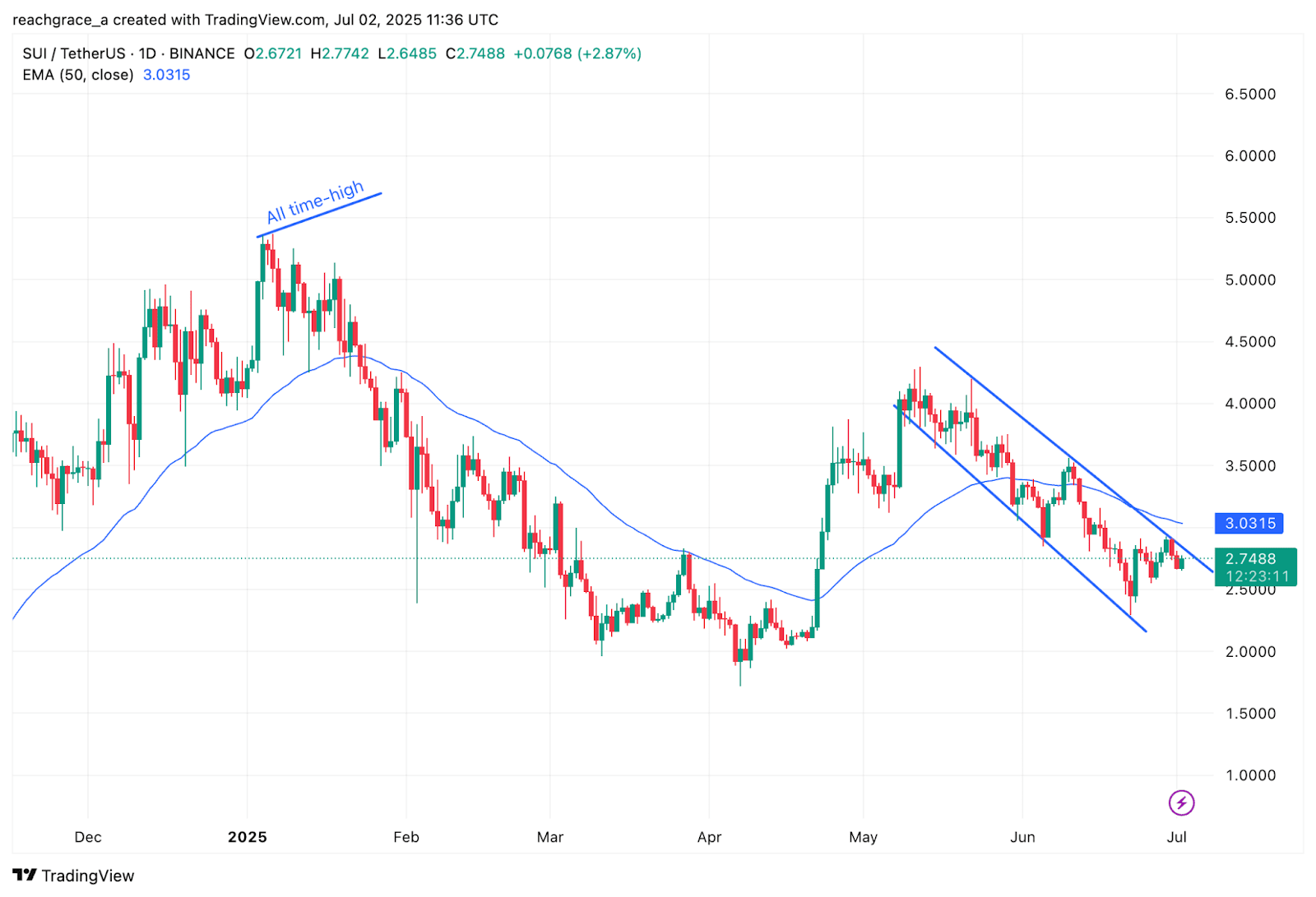 Tranzacționându-se în jur de 2,71 dolari în momentul de față, SUI a avut dificultăți în a recâștiga momentum optimist de la scăderea din vârful său de la începutul acestui an. În ciuda înregistrării unei creșteri modeste de 1,4% în ultimele 24 de ore, SUI rămâne sub presiune, scăzând cu 15,5% în ultimele 30 de zile, aproximativ 22,9% de la vârful de 3,50 dolari din această lună și 48,1% sub maximul său istoric de 5,20 dolari.