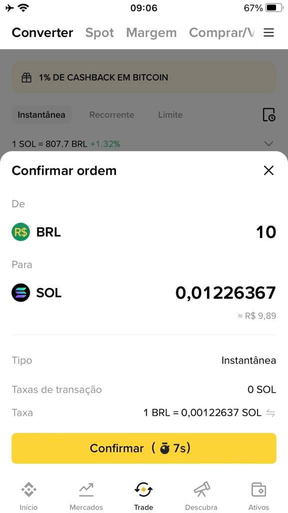 Binance: Folosind funcția "Convert", prețul a fost de 807,70 BRL pe SOL. S-a primit 0,01226367 SOL, fără niciun comision, iar procesul a fost foarte agil.
