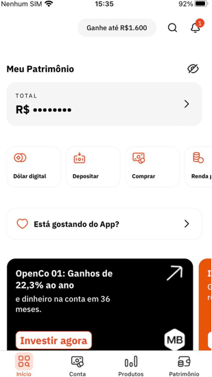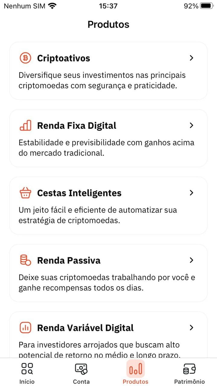 În Mercado Bitcoin, prima impresie este de simplitate: meniul de jos aduce Acasă, Produse, Patrimoniu și Cont, cu acces rapid la funcții precum Depozitare, Cumpărare și Venit Pasiv. Pentru cei care încep, această structură ajută la reducerea curbei de învățare și evită distragerile inutile.