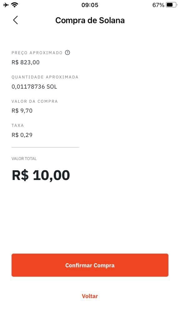 Mercado Bitcoin: Cotația a fost de aproximativ 823,00 BRL pe SOL, cu un comision de 0,29 BRL. Rezultatul final a fost 0,01178736 SOL net.