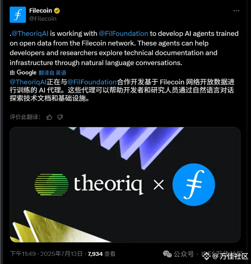Filecoin-Theoriq的合作不仅仅是一个产品开发;它代表了 AI 和去中心化基础设施的融合。两个平台正在合作开发智能人工智能代理,这些代理可以使用Filecoin的开源数据处理和阐明复杂的区块链概念。这种集成旨在使 Filecoin 更易于访问和用户友好,解决区块链领域的主要挑战之一:技术复杂性。Theoriq 创建的 AI 代理将允许新开发人员与 Filecoin 的基础设施进行交互,而无需深厚的技术专长,同时也为经验丰富的开发人员提供了一种更高效的方式来导航文档和实时故障排除。