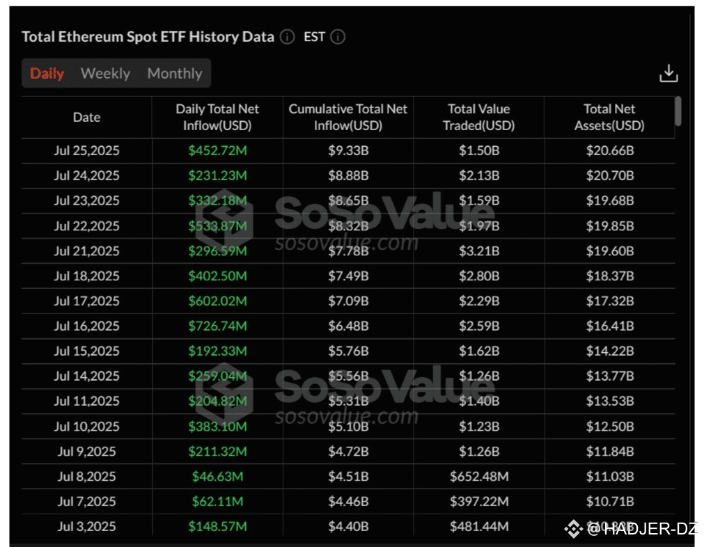 سجلت صناديق الاستثمار المتداولة في البورصة لعملة الإيثريوم جلسة قوية أخرى يوم الجمعة، حيث اجتذبت تدفقات صافية بقيمة 452.72 مليون دولار، لتمتد سلسلة تدفقاتها إلى 16 يومًا متتاليًا من التداول، وفقًا لبيانات من SoSoValue.