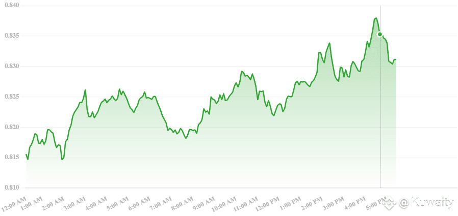 يتم تداول $ADA حالياً عند حوالي 0.83 دولار، بارتفاع يتراوح بين+1.2% إلى 5.5% . كما ويقدر حجم التداول خلال الـ24 ساعة، بنحو 0.95 إلى 1.3 مليار دولار، مع قيمة سوقية تقترب من 29–30 مليار دولار.