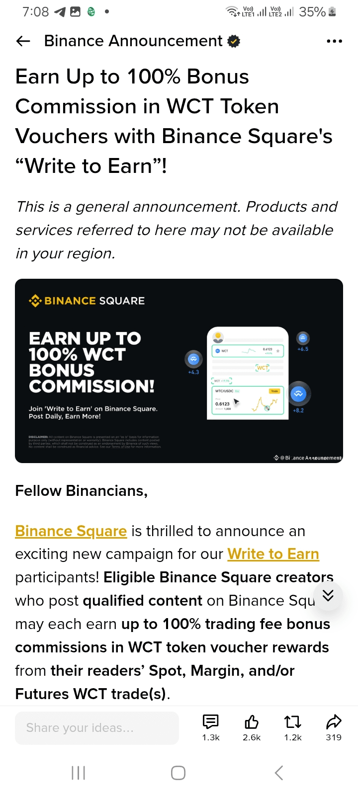 Binance Oferă 100% Comision #Write2Earn Recompensă fără postare la Bianance Squate #WalletConnect #Write2Earn!
