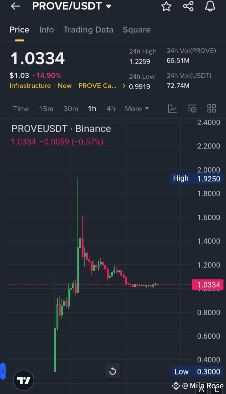 $PROVE /USDT a scăzut în ultimele 24 de ore după volatilitatea de după lansare. Prețul se stabilizează în apropierea zonei de $1.00 după ce a atins un minim de $0.99, care ar putea acționa ca o bază pe termen scurt. Volumul rămâne ridicat, sugerând că speculatorii sunt încă activi.