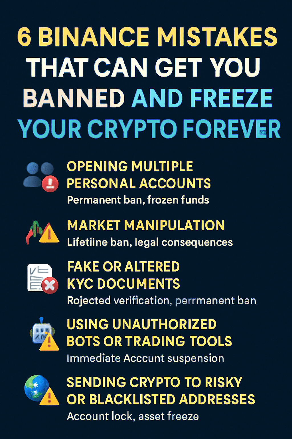 Dar o greșeală — chiar și neintenționată — poate duce la o interdicție permanentă și la înghețarea fondurilor tale pe termen nelimitat. Indiferent dacă ești un trader experimentat sau nou în crypto, este esențial să înțelegi ce ar putea pune contul tău în pericol.