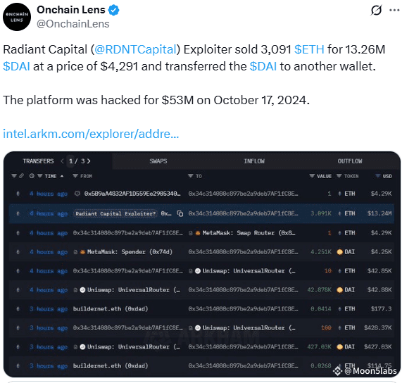 This sale represents only a fraction of the $53 million stolen during the October 17, 2024 exploit on the cross-chain lending protocol Radiant Capital. It appears the hacker is gradually liquidating different cryptocurrency positions from the original theft.