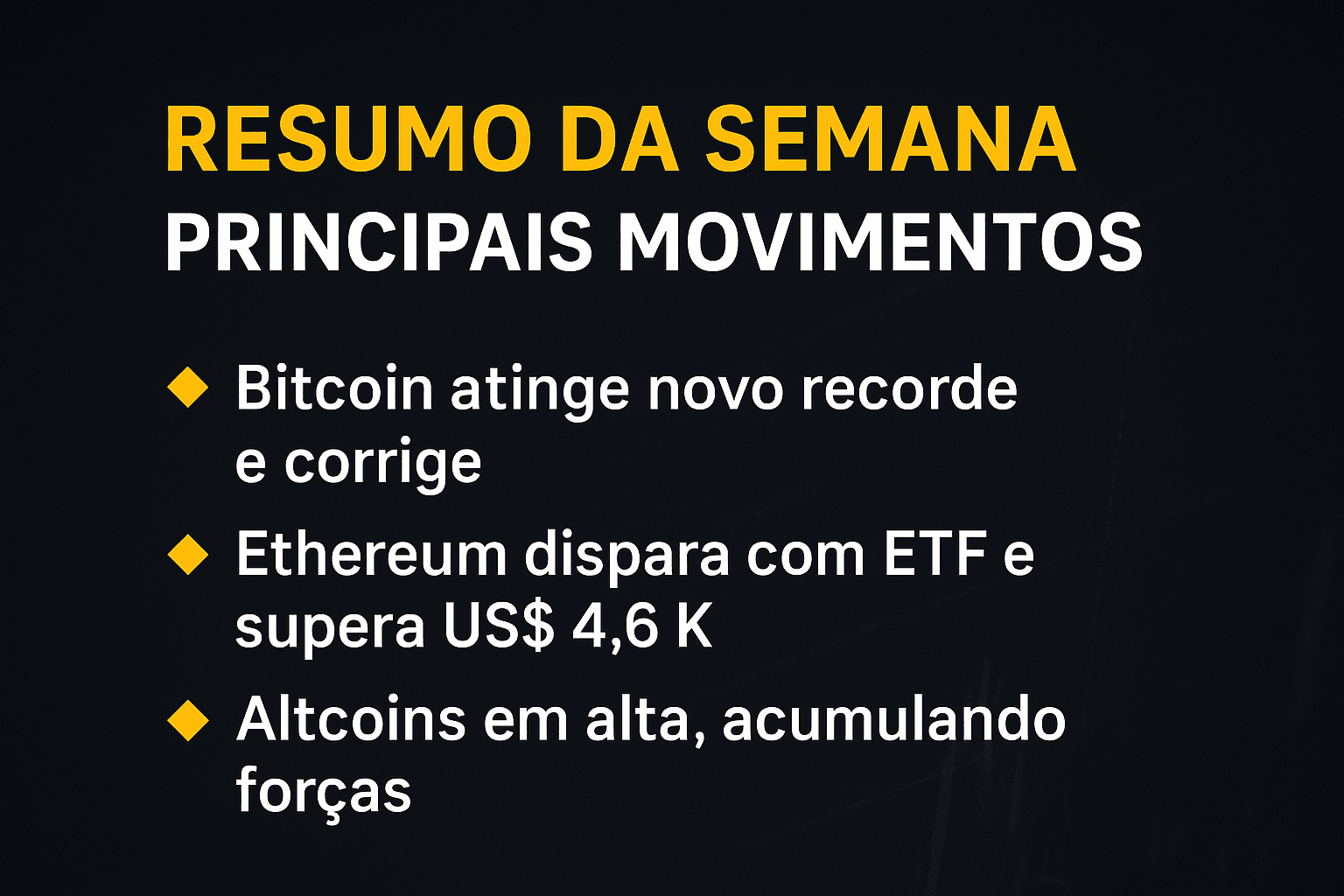 Ethereum valorizou mais de 20% na semana, chegando a US$ 4 600+, impulsionado por entrada maciça em ETFs — com quase US$ 1 bilhão em um único dia, liderado por BlackRock e Fidelity.