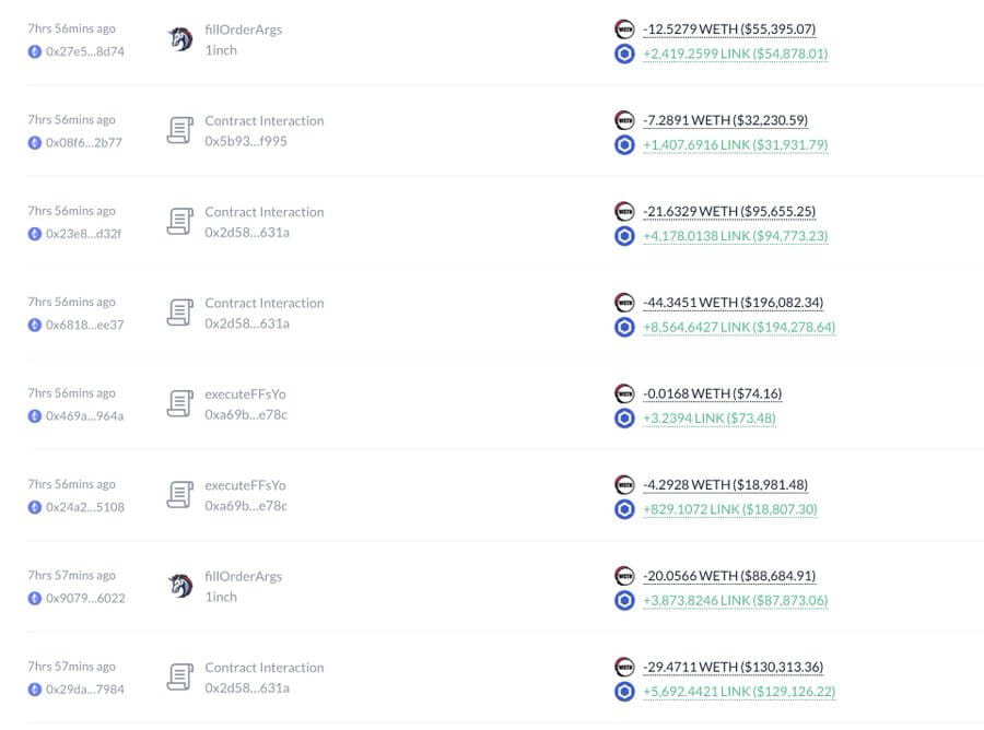 O balenă crypto a intrat pe piață cu convingere, cheltuind 4.806 $ETH (21,25 milioane USD) pentru a acumula 938.489 $LINK în cinci portofele în ultimele 8 ore.