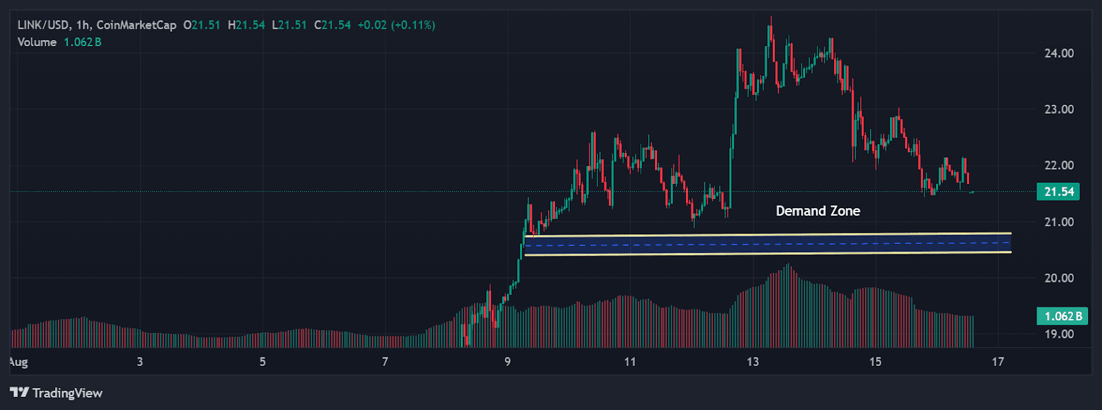 În articolul meu anterior, am subliniat zona de cerere de 21–20,60 USD ca fiind zona cheie de urmărit și de asemenea 23–24 USD ca obiectivul nostru pe care$LINK l-a depășit. LINK a respectat perfect această zonă, menținându-și baza în timp ce balenele acumulau.